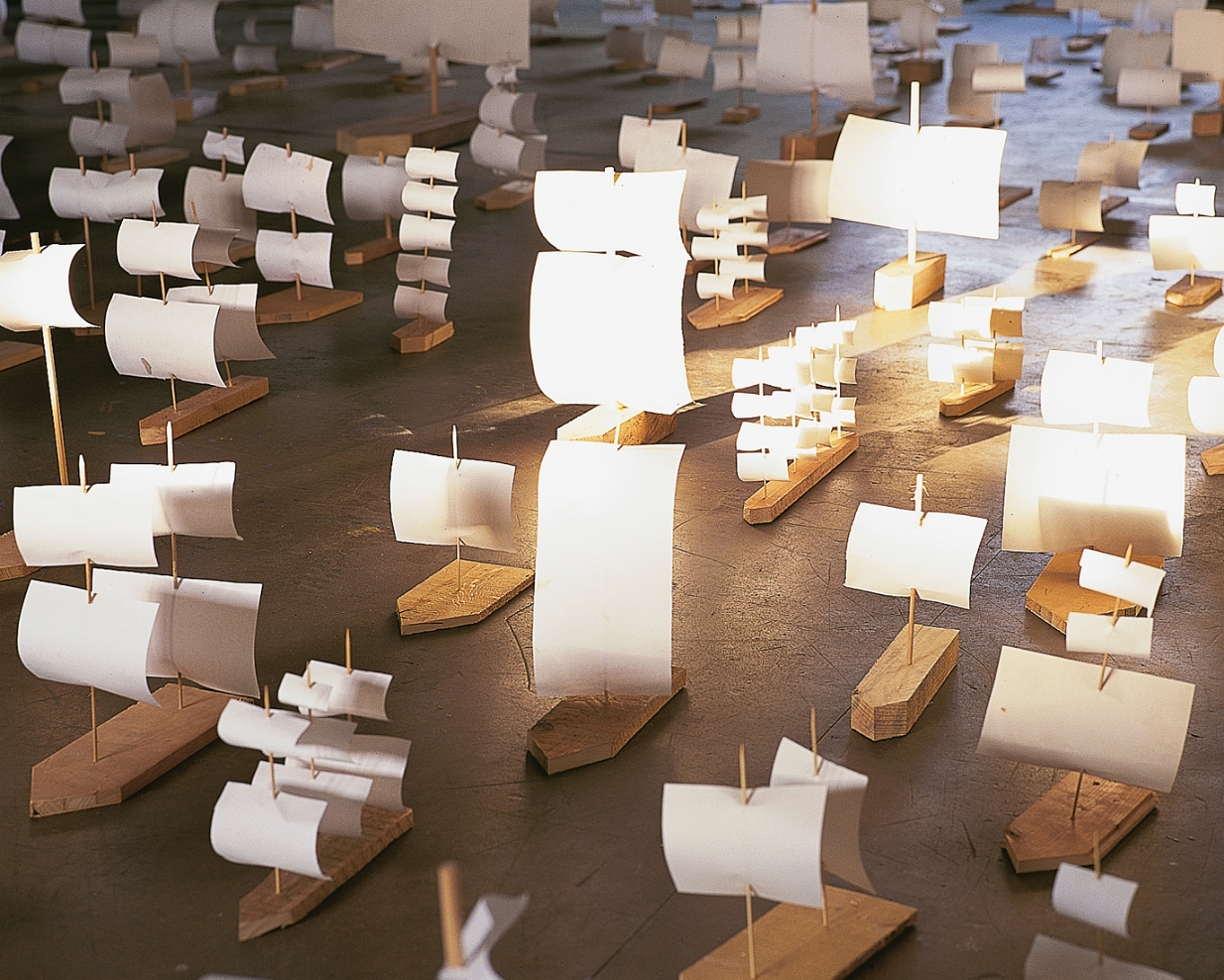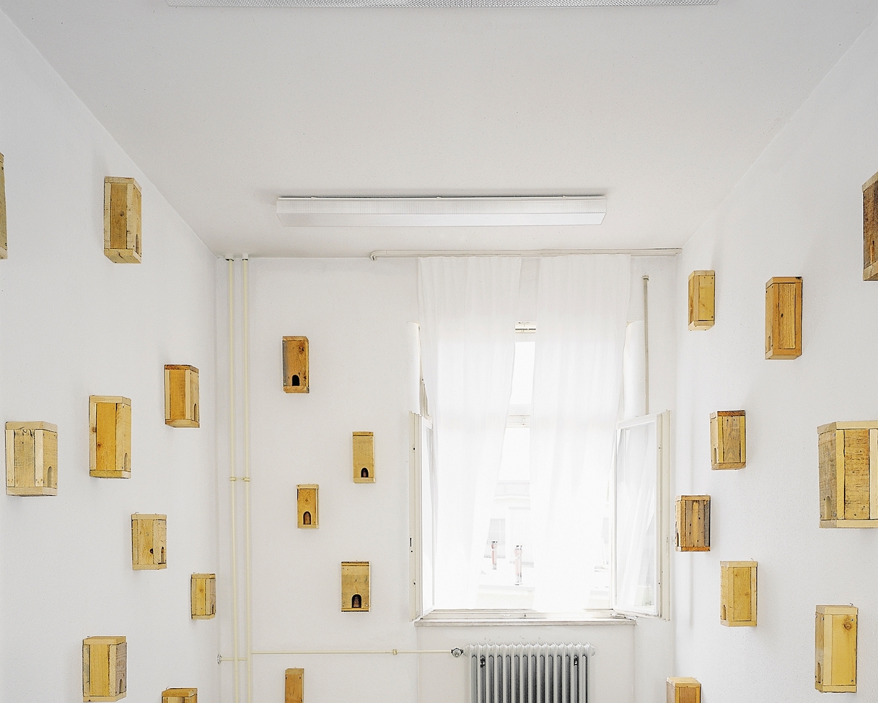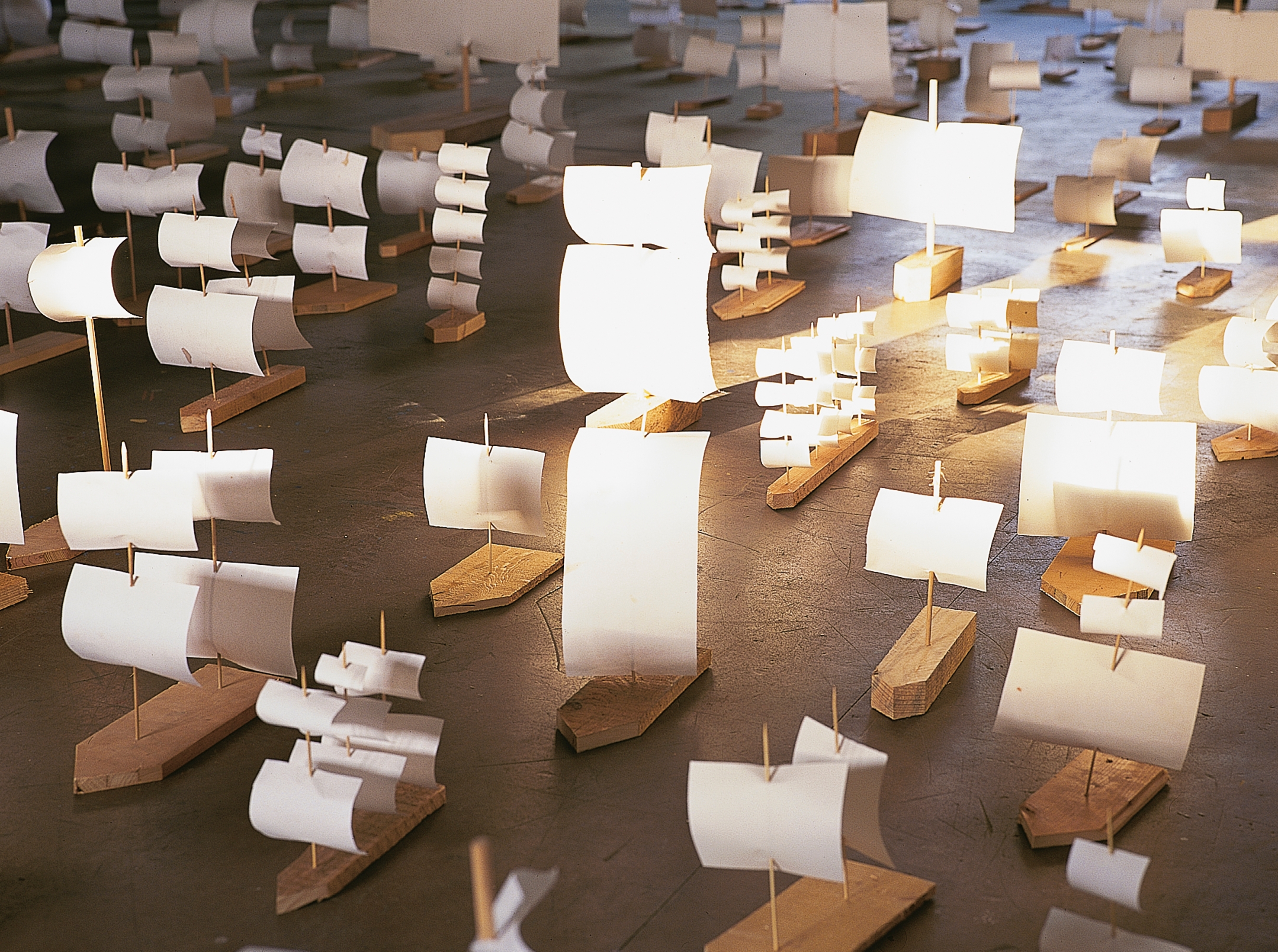 Die Vögel, Holz, Stoff, Vorhang: je 420x75 cm, 1998 Die Vögel, Holz, Stoff, Vorhang: je 420x75 cm, 1998 Regatta, Holz, Papier, 1999 Holzinstallationen, 1998 - 2000