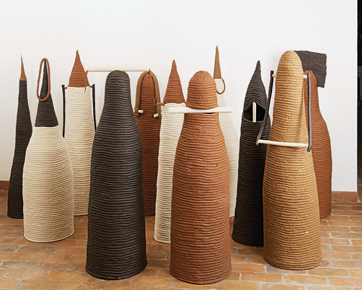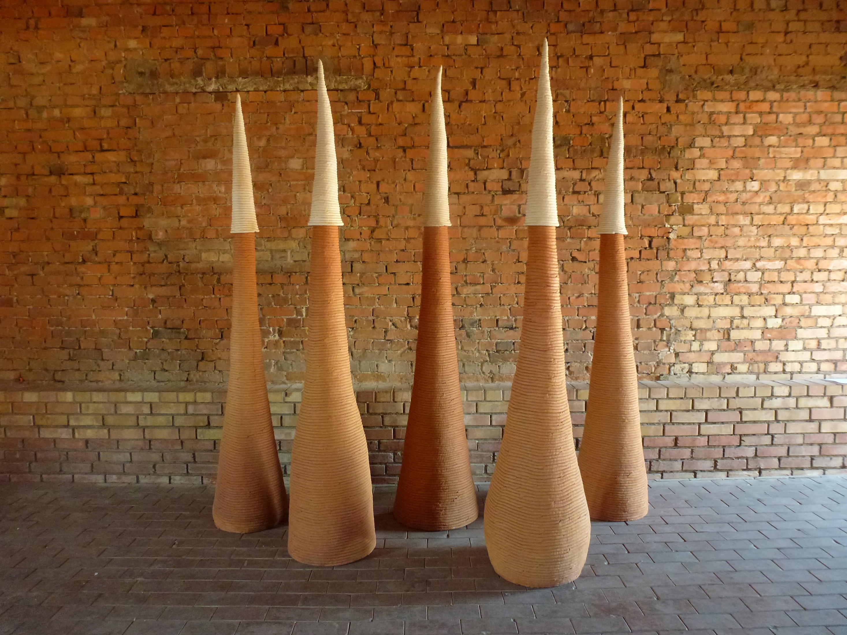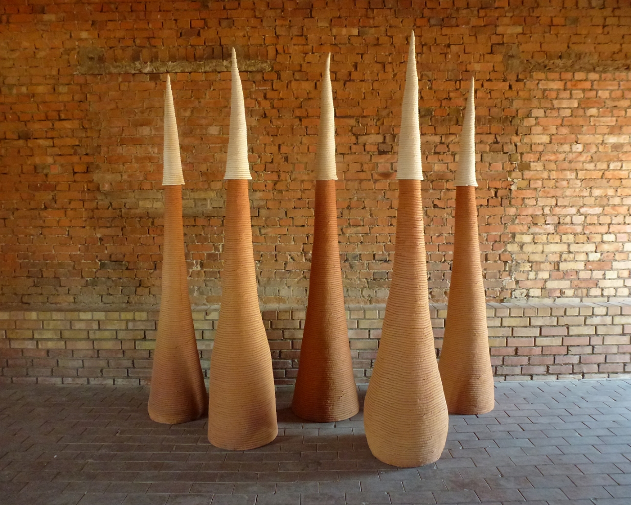 Schutztruppe I, Keramik, gebrannt, max. Höhe 146 cm, 2003  O.T., Keramik, gebrannt, max. Höhe 71 cm, 2004  Paar, Keramik gebrannt, Figur rechts: H 79 cm, 2011  Engel, Keramik gebrannt,2 Figur von rechts:H 102 cm, 2011 Hoheiten, Keramik, gebrannt, max. H 270 cm, 2012  Schutztruppe II, Keramik, gebrannt, 2004, Detail Kisten, 2005Turmfiguren, 2009 - 10
