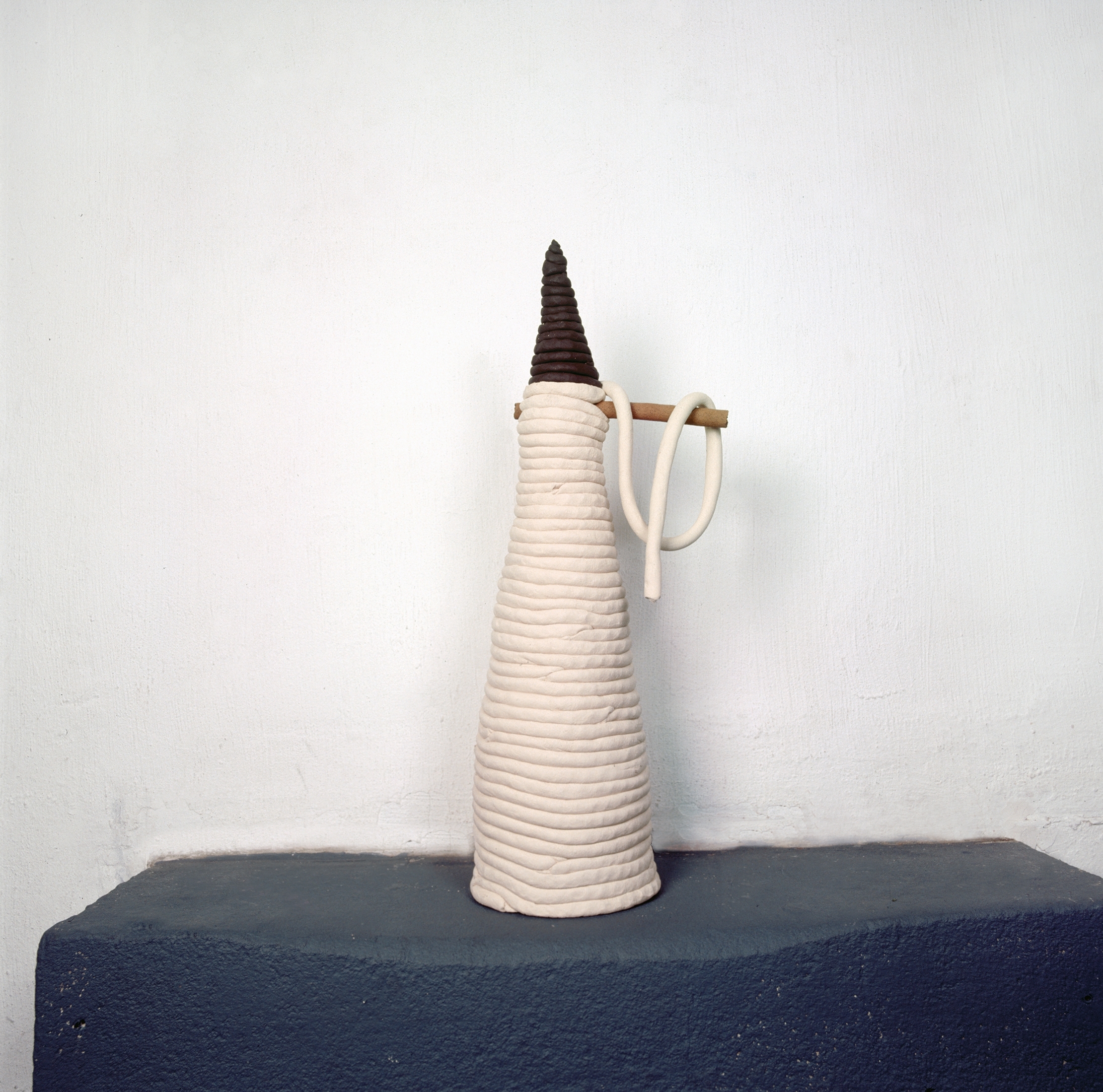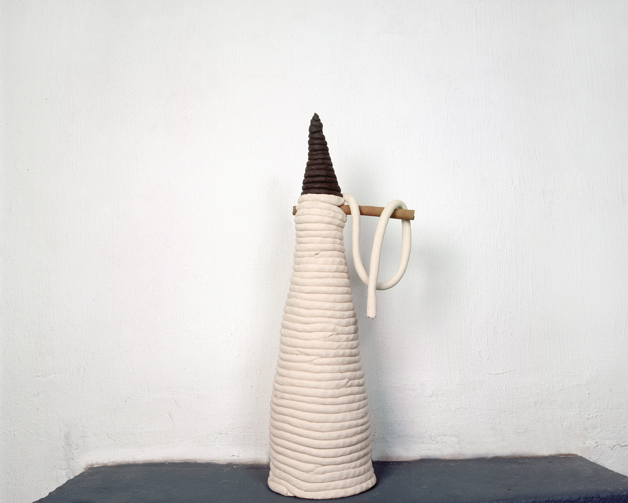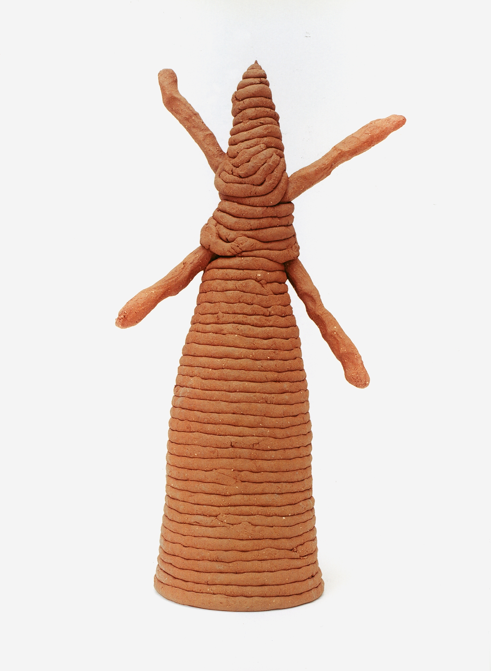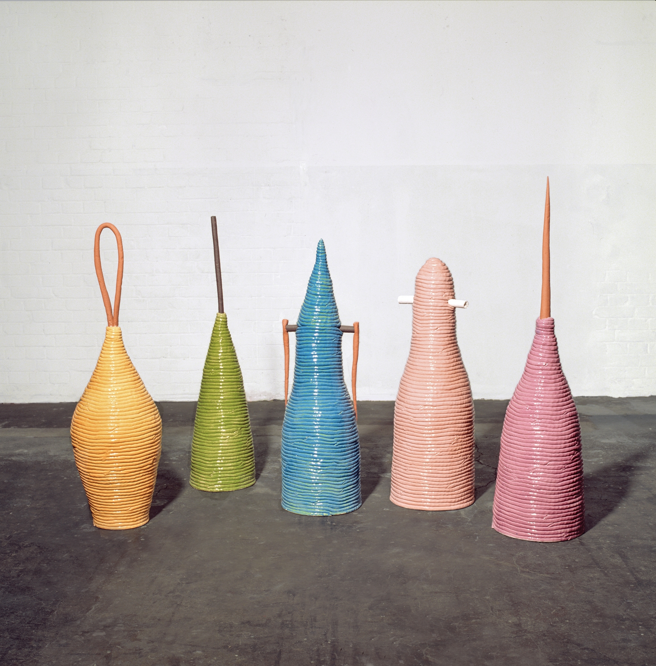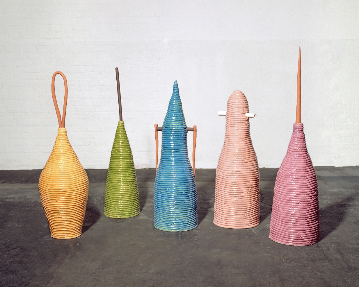 O.T., Keramik, gebrannt, H 46 cm, 2003   O.T. Keramik, gebrannt, H 71 cm, 2003  Buntröckchen-Schlagstöckchen, Keramik, glasiert und gebrannt, max. Höhe 134 cm , 2003 Rollen und Schlingen, 1992 - 95Die Fremden 1995 - 2001