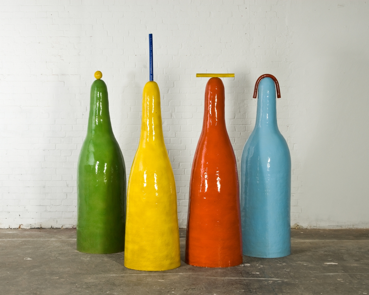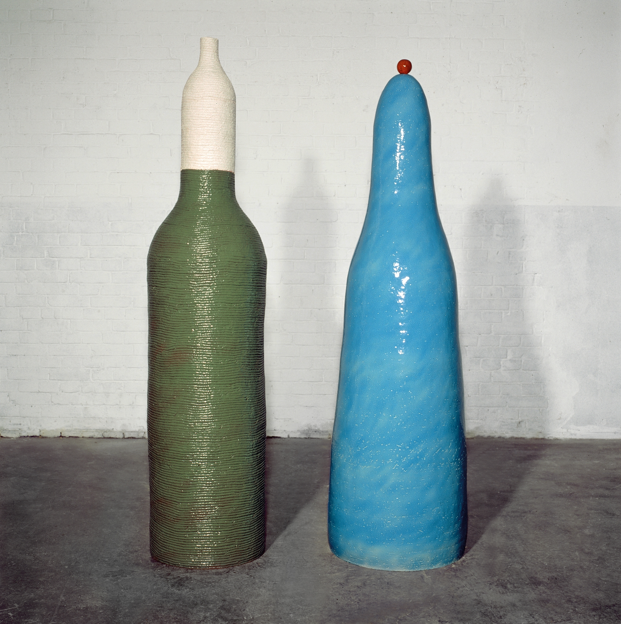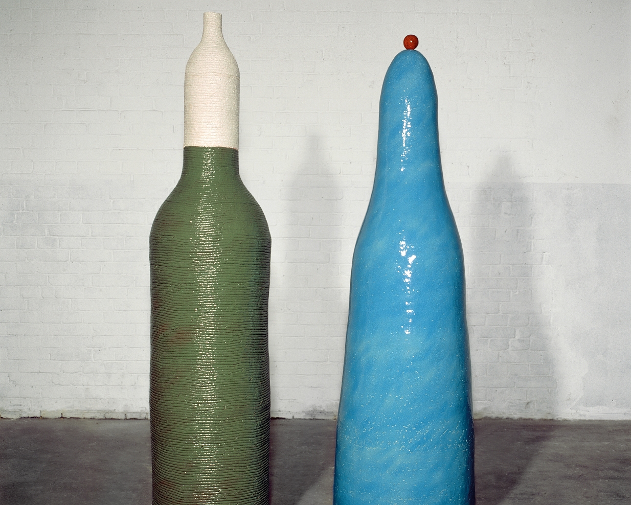 Flaschenmann und Kugelfrau, Keramik, gebrannt, H 206 cm, 2001  Die Gaukler, Keramik, glasiert u. gebrannt, max. H 224 cm, 2011,  Festung Schoenenbourg, Elsass, 2014 Krüge und Kannen, 2001Fuhrparlk III, 2000 - 2001