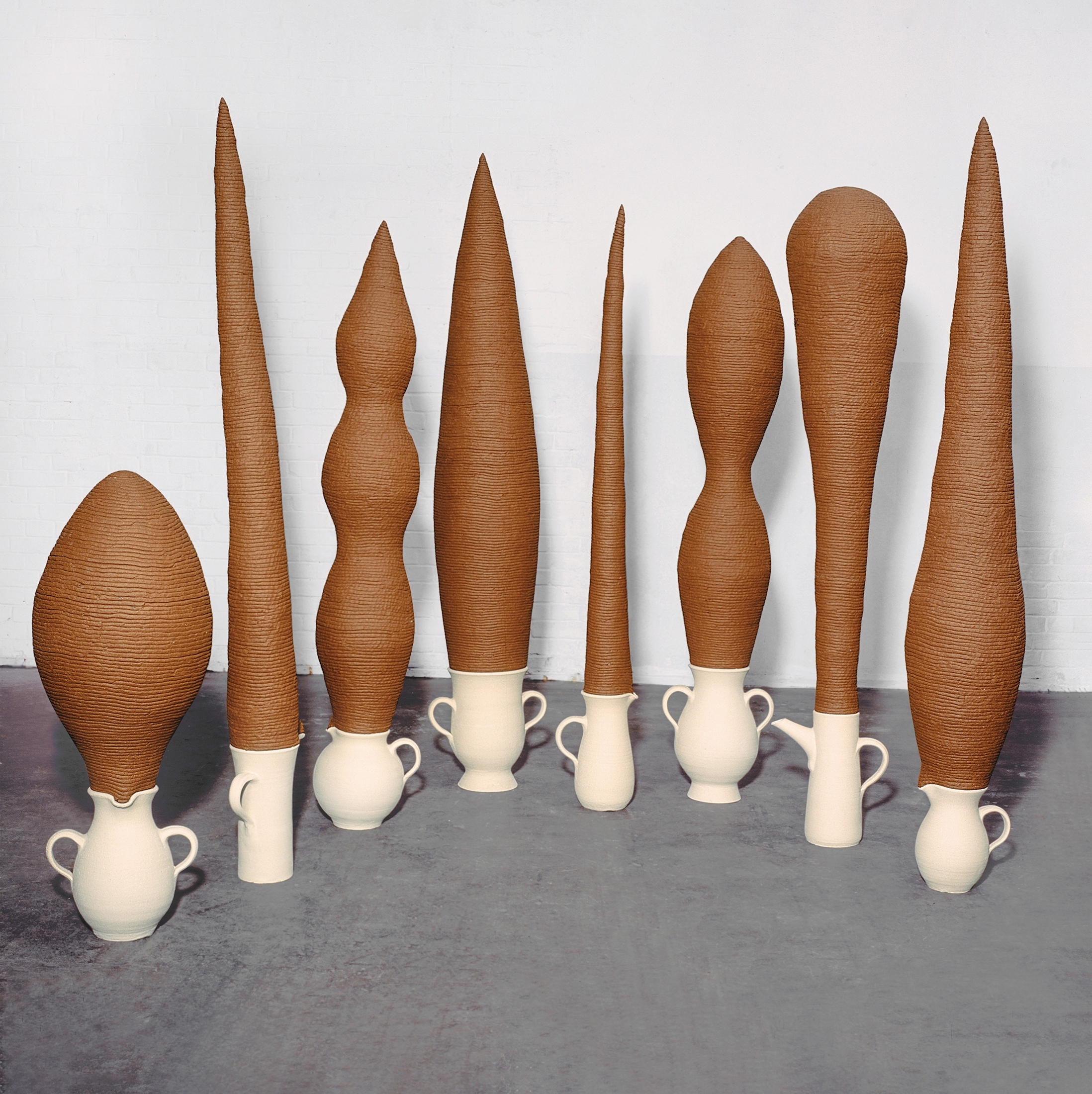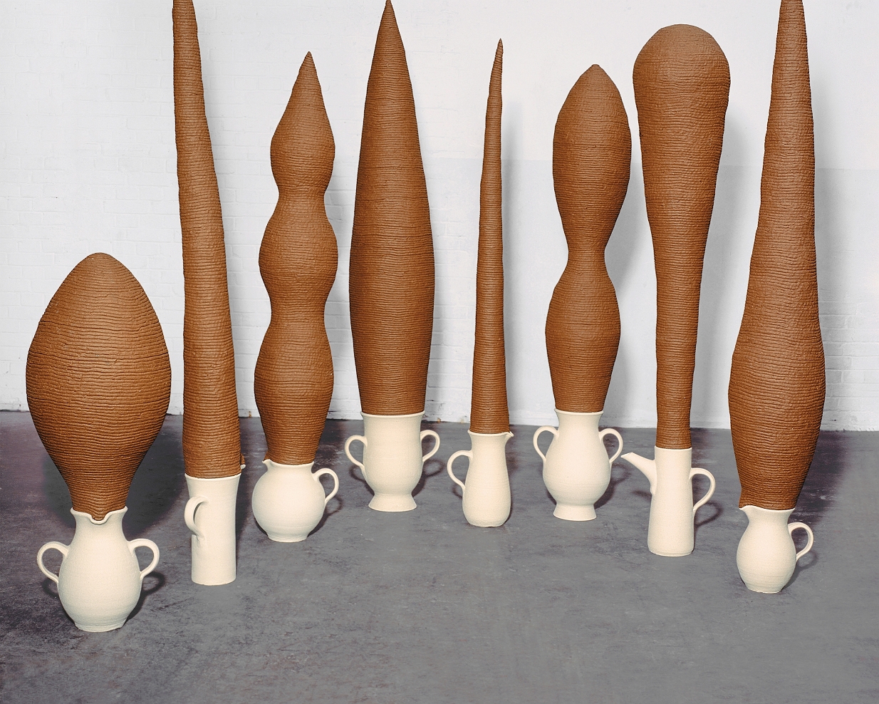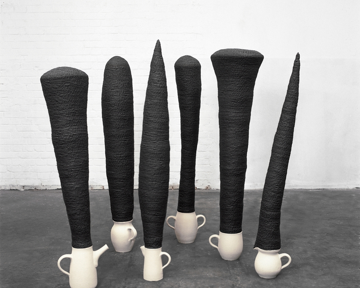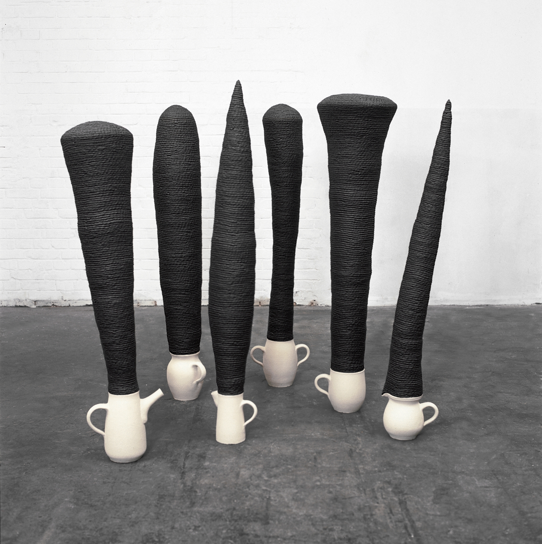 Krüge und Kannen I, Keramik, gebrannt, max. H 142 cm, 2001  Krüge und Kannen II, Keramik, gebrannt, max H 210 cm, 2001  Detail Köpfe, 2001Keramische Skulpturen, 2001